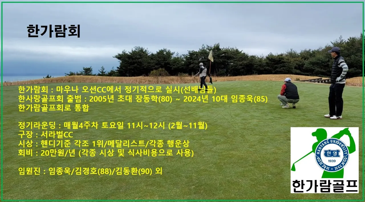 한가람회는 재울 한양인 및 기타지역 한양인도 회원 가입 및 게스트로 참석 가능한 골프 모임입니다. 많은 한양인들의 관심 부탁드립니다.